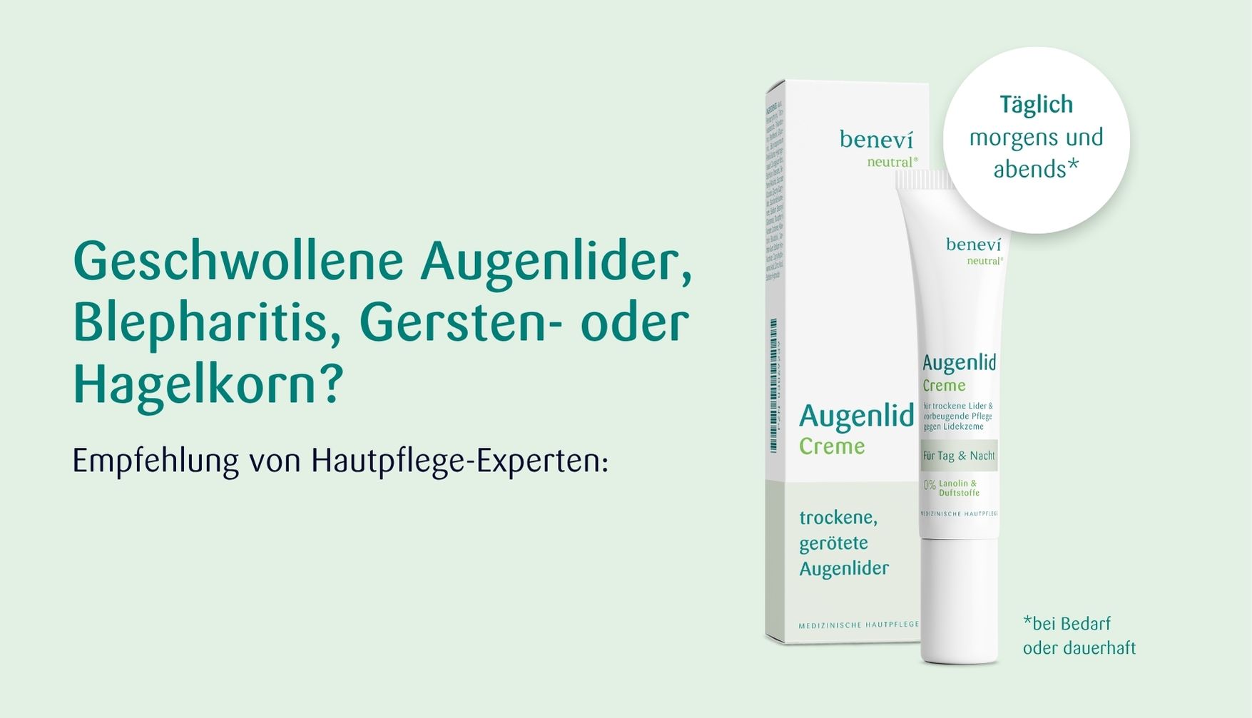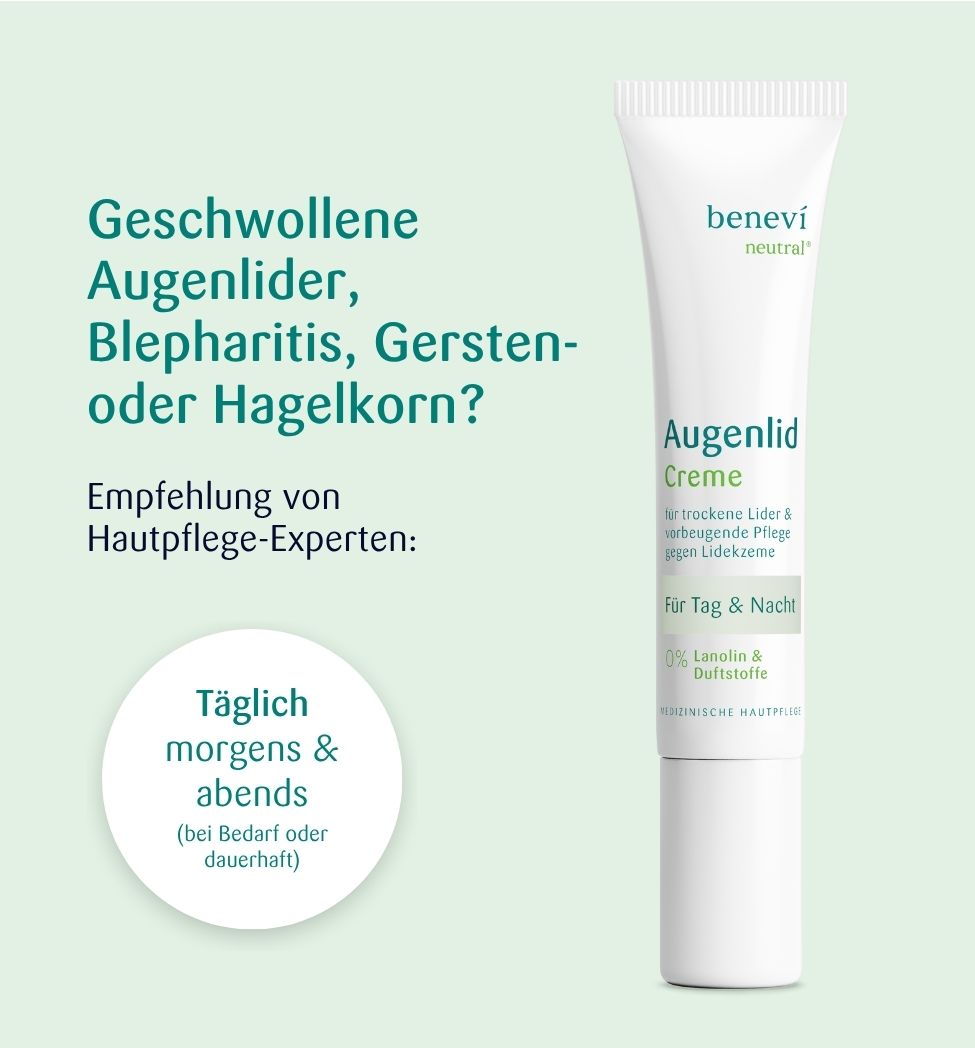 Augenlid-Creme: Eine reizfreie, beruhigende Creme wie die benevi neutral Augenlid-Creme kann helfen, die empfindliche Haut um die Augenlider zu pflegen und zu beruhigen. Sie enthält keine Duftstoffe, Farb- oder Konservierungsmittel und kann helfen, die Hautbarriere zu stärken und Reizungen zu lindern.
