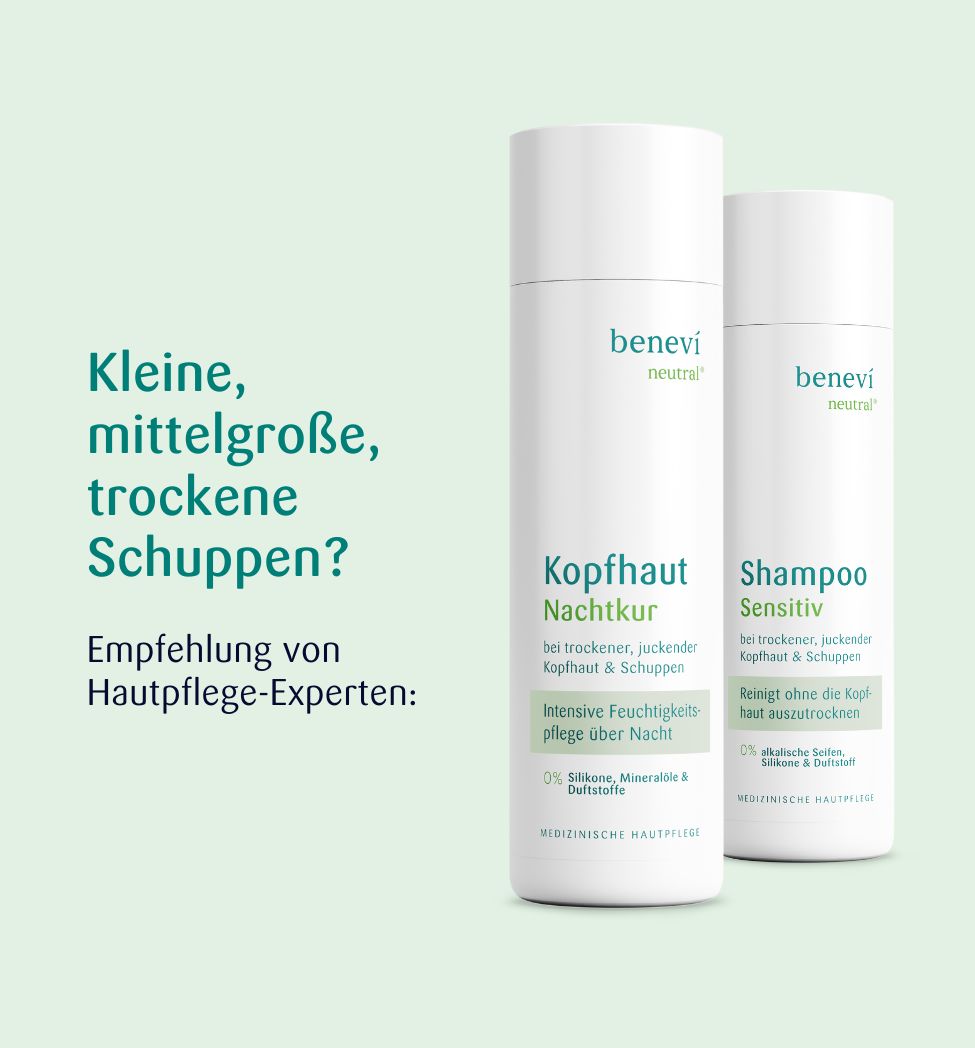 Das geht besonders gut mit Lotionen wie beispielsweise der benevi neutral KOPF-LOTION 50ml (mit Applikator für tagsüber) oder der benevi Kopfhaut-NACHTKUR 200ml (für eine langeinwirkende KUR über Nacht).