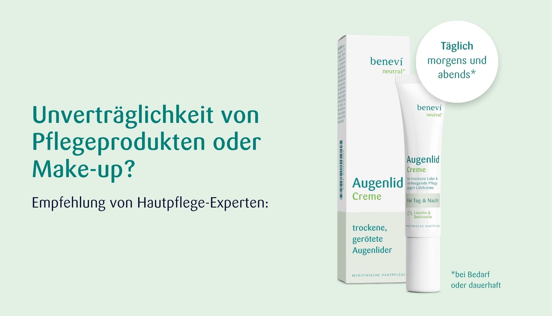 Morgens und abends: Um optimale Ergebnisse zu erzielen, solltest du die benevi neutral Augenlid-Creme zweimal täglich anwenden – einmal am Morgen und einmal am Abend. Die konsequente Anwendung sorgt dafür, dass deine empfindliche Haut rund um die Uhr optimal gepflegt, mit Feuchtigkeit versorgt und die natürliche Schutzbarriere gestärkt wird.