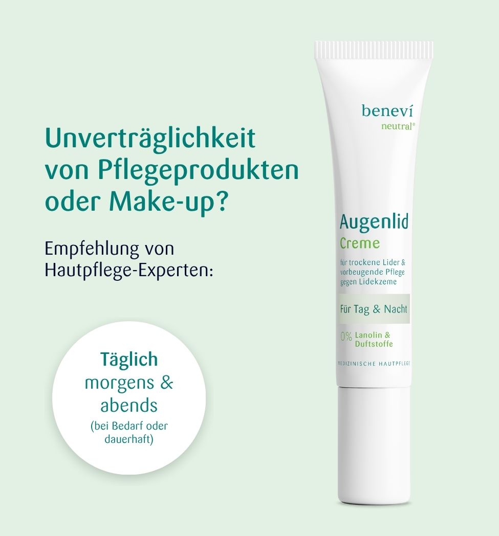 Die benevi neutral Augenlid-Creme wurde speziell für Menschen, die empfindliche Augenlider haben oder zu solchen tendieren, d. h. trocken, gerötet, schuppend, juckend, gereizt oder zu Lidekzemen neigen, entwickelt.