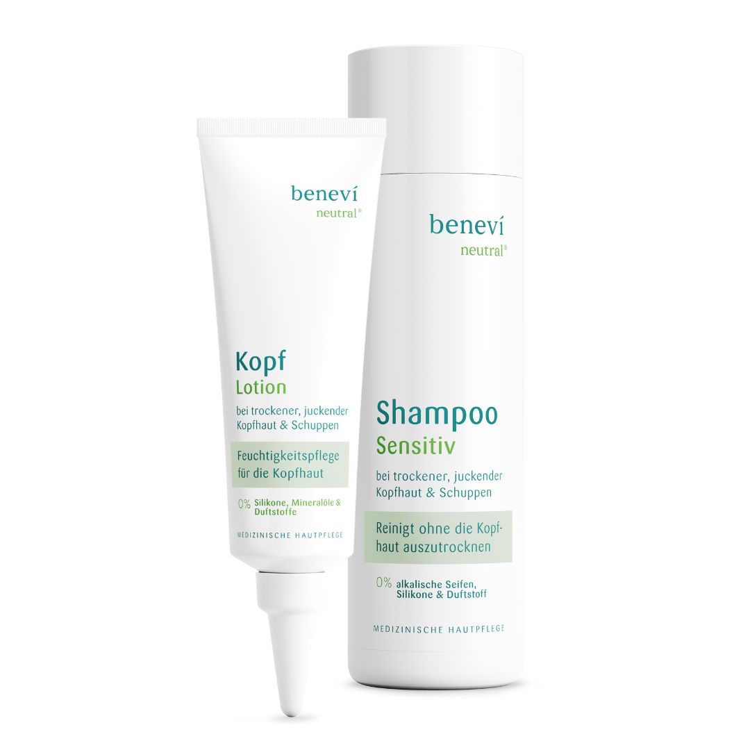 Leiden Sie unter trockener, juckender, schuppender, gereizter Kopfhaut? Entdecken Sie das benevi neutral Trockene Kopfhaut Pflegeset für eine beruhigende und intensive Pflege. Diese spezielle Formel von Lotion und Shampoo bringt Ihre Kopfhautbarriere wieder ins Gleichgewicht und schützt vor Austrocknung. Erleben Sie eine nachhaltige Lösung gegen Juckreiz, Trockenheit und Schuppen.